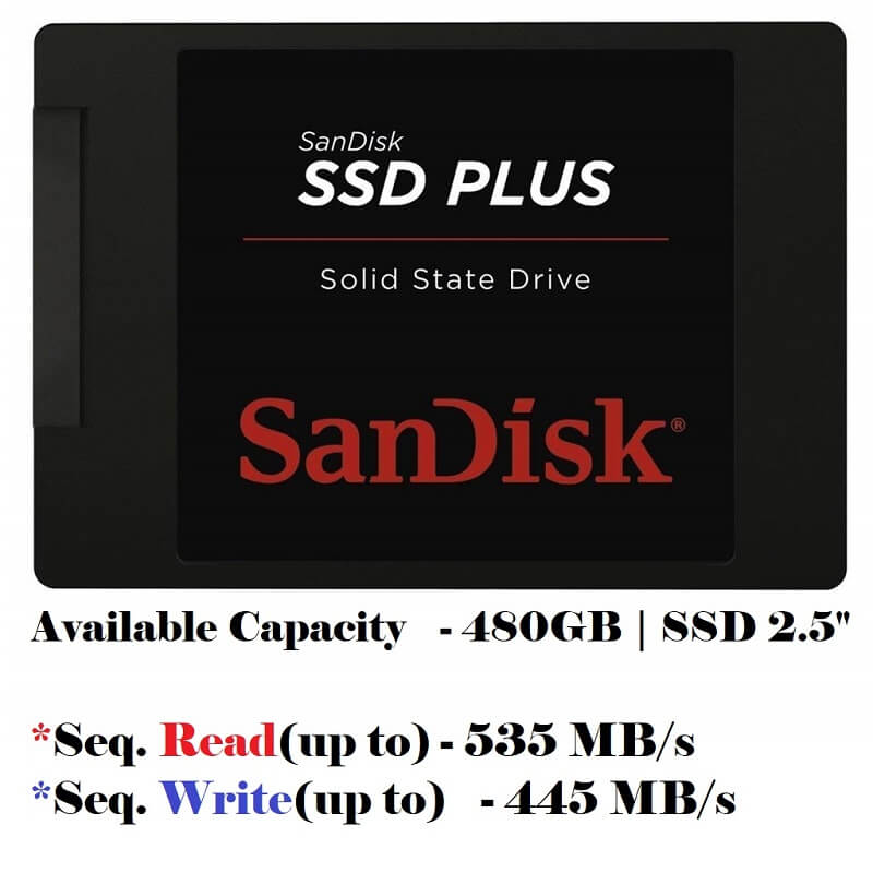 SanDisk 480GB SSD Plus, SATA III, 2.5″ Inch, 535MB/s Read, 445MB/s Write, SDSSDA-480G-G26
