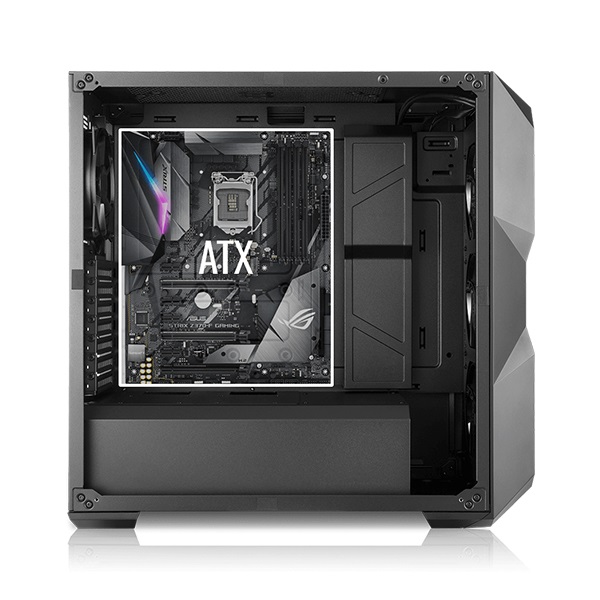 يناسب التصميم الداخلي الفسيح جميع اللوحات الأم القياسية لاحتياجات نظامك. دع التكوين الخاص بك يبرز مع خلفية سوداء بالكامل.
