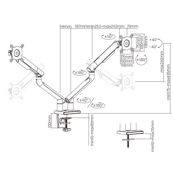 ● تصميم لوحة VESA القابل للفصل: يتيح سهولة التركيب ● آلية شد الزنبرك المدمجة: لتعديلات الوزن بشكل مثالي ● مؤشر الشد: مصمم لمحاذاة شد الزنبرك عند تركيب شاشات متعددة ● إيقاف دوران 180 درجة: يمنع ذراع الشاشة من التأرجح في الشاشات أو الجدران ● نظام مدمج لإدارة الكابلات: من أجل مساحة عمل منظمة وأنيقة
