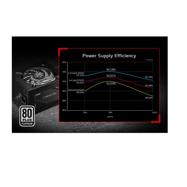 تحقق كفاءة XPG CYBERCORE 92.91٪ 115VAC عند تحميل 50٪ (درجة حرارة 25 درجة مئوية) ، مما يوفر أداءً مثاليًا حتى وفقًا لمعايير 80 PLUS PLATINUM.