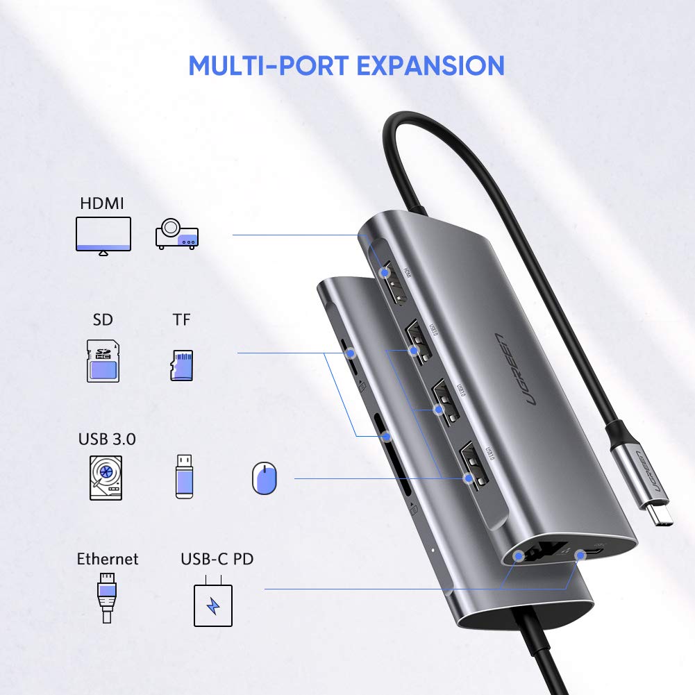 Ethernet, HDMI, SDHC, SDXC Ugreen USB-C Multifunction (HDMI+ 3 Port USB+ Pd+ Sd+ Tf+ Rj45) ( 8 in 1 Hub )