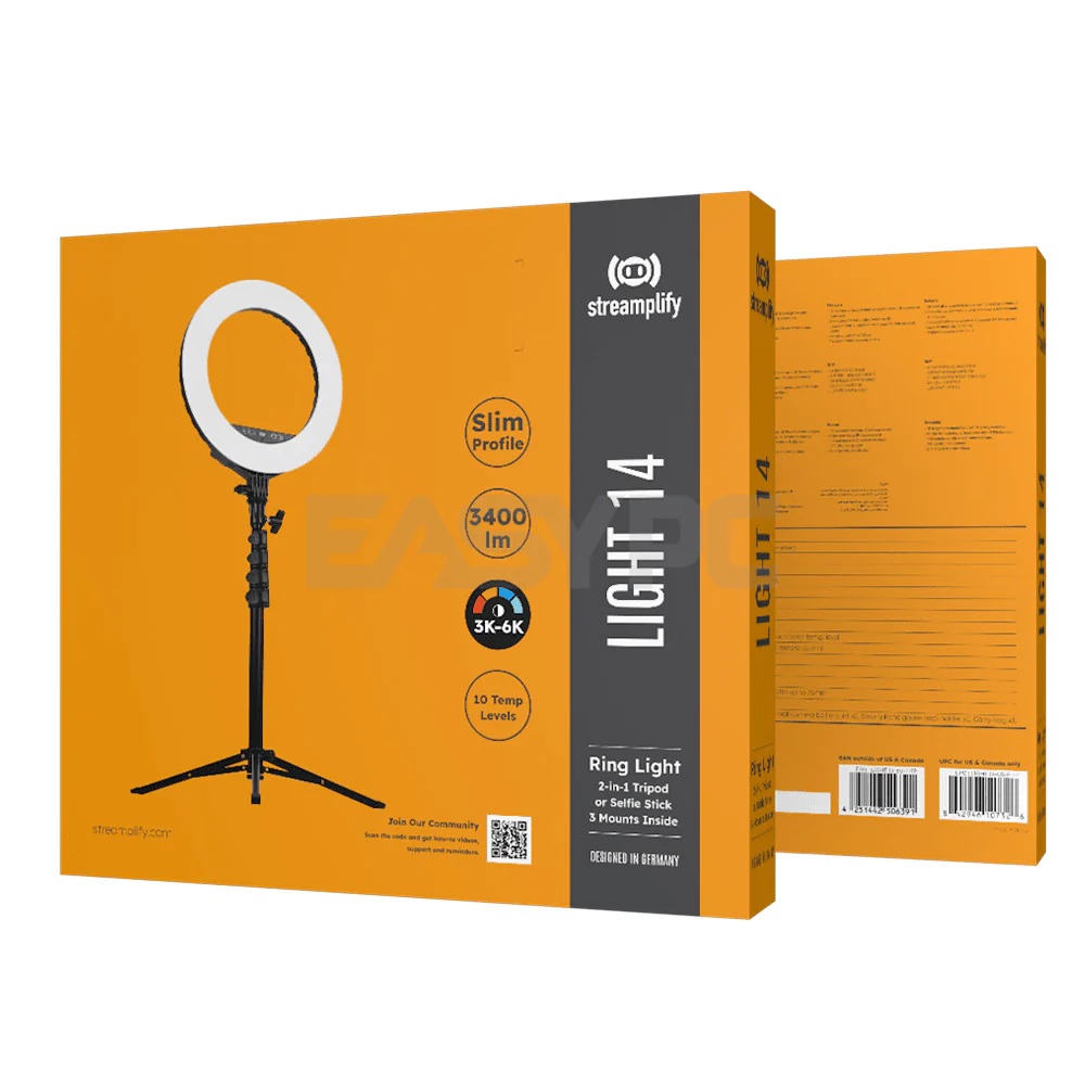 مصباح الحلقة Streamplify ✅ حجم خارجي: 36 سم / 14 بوصة ✅ درجة حرارة اللون: 3000K - 6000K ✅ ارتفاع الحامل الثلاثي القابل للتمديد: 0.5م ~ 1.7م ✅ يدعم الهواتف الذكية بعرض يصل إلى: 76 مم ✅ دعم تركيب الكاميرا بحامل Cold Shoe / جهاز تحكم عن بعد