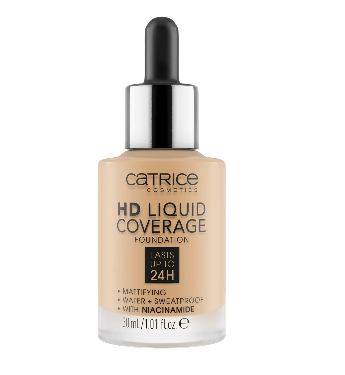 تأثير البشرة الثانية: يمنحك كريم الأساس السائل HD Coverage Foundation بشرة ثانية ويمنحك بشرة مثالية مخملية غير لامعة - لمدة تصل إلى 24 ساعة! يخفي الملمس السائل الخفيف للغاية ذو التغطية العالية والطبيعية عيوب البشرة، وهو غني بالنياسيناميد الذي يعمل على تحسين البشرة كما أنه مقاوم للماء والعرق والبقع. لا تحتوي التركيبة على البارابين أو البلاستيك الدقيق.