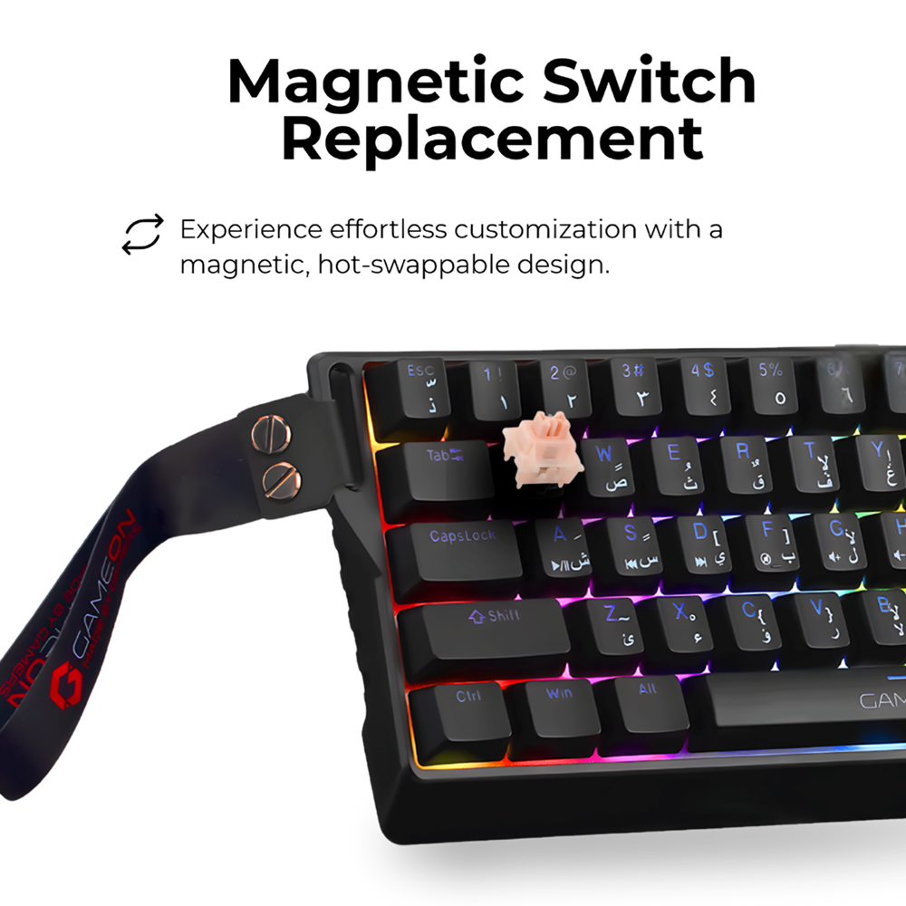- لوحة مفاتيح ألعاب ميكانيكية مغناطيسية سلكية GameOn MAGPRO Series 1K8RS بإضاءة RGB (تصميم 60%)، سويتش وردي (Pink Switch) – إنجليزي/عربي