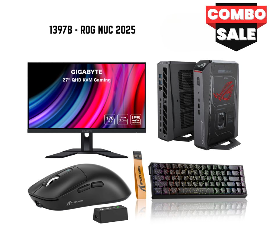 حزمة ASUS 1397 – كمبيوتر ألعاب مصغر ROG NUC (2025) بمعالج Intel Ultra 9 وبطاقة RTX 5070 Ti وذاكرة 32GB وتخزين 1TB NVMe مع شاشة Gigabyte M27Q مقاس 27 بوصة ولوحة مفاتيح Attack Shark X68MAX وفأرة X3PRO