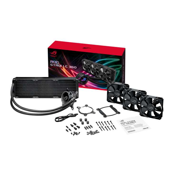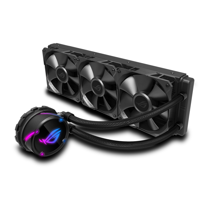 ROG Strix LC 360 all-in-one liquid CPU cooler with Aura Sync RGB, and triple ROG 120mm radiator fans