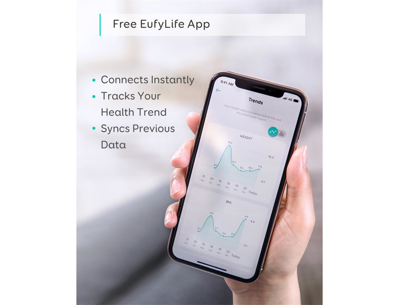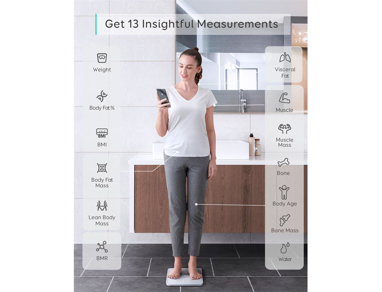 - الصحة الشاملة: تعلم على الفور 14 قياسًا ثاقبًا لصحة جسمك ، مثل الوزن ودهون الجسم ومؤشر كتلة الجسم وكتلة العظام وكتلة العضلات والمزيد.