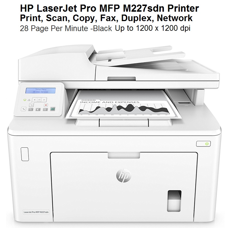 - HP M227sdn Laser Jet Pro MFP , Printer Scanner Copier Fax , Black laser Printer , 28 Page Per Minute Up to 1200 x 1200 dpi