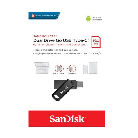 SanDisk 64GB Ultra Dual Drive Go USBC Flash Memory 150MB/s read Windows, Mac OS