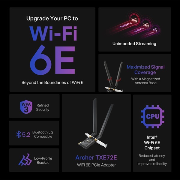 - TPLINK AXE5400 WiFi 6E Tri-band Bluetooth 5.2 PCIe Adapter, TXE72E