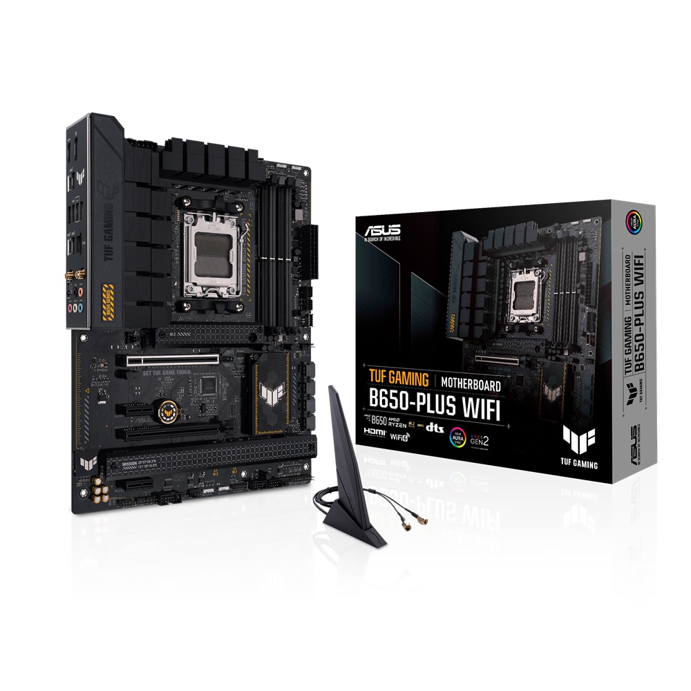 ASUS TUF GAMING B650-PLUS WIFI takes all the essential elements of the latest AMD Ryzen 7000-series processors and combines them with game-ready features and proven durability. Engineered with military-grade components, an upgraded power solution and a comprehensive cooling system, this motherboard goes beyond expectations with rock-solid and stable performance for marathon gaming. TUF GAMING motherboards also undergo rigorous endurance testing to ensure that they can handle conditions where others may fail. Aesthetically, this model incorporates rugged off-black and geometric design elements to reflect the dependability and stability that defines the TUF GAMING series.
