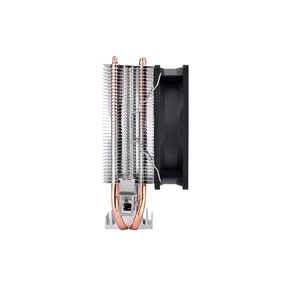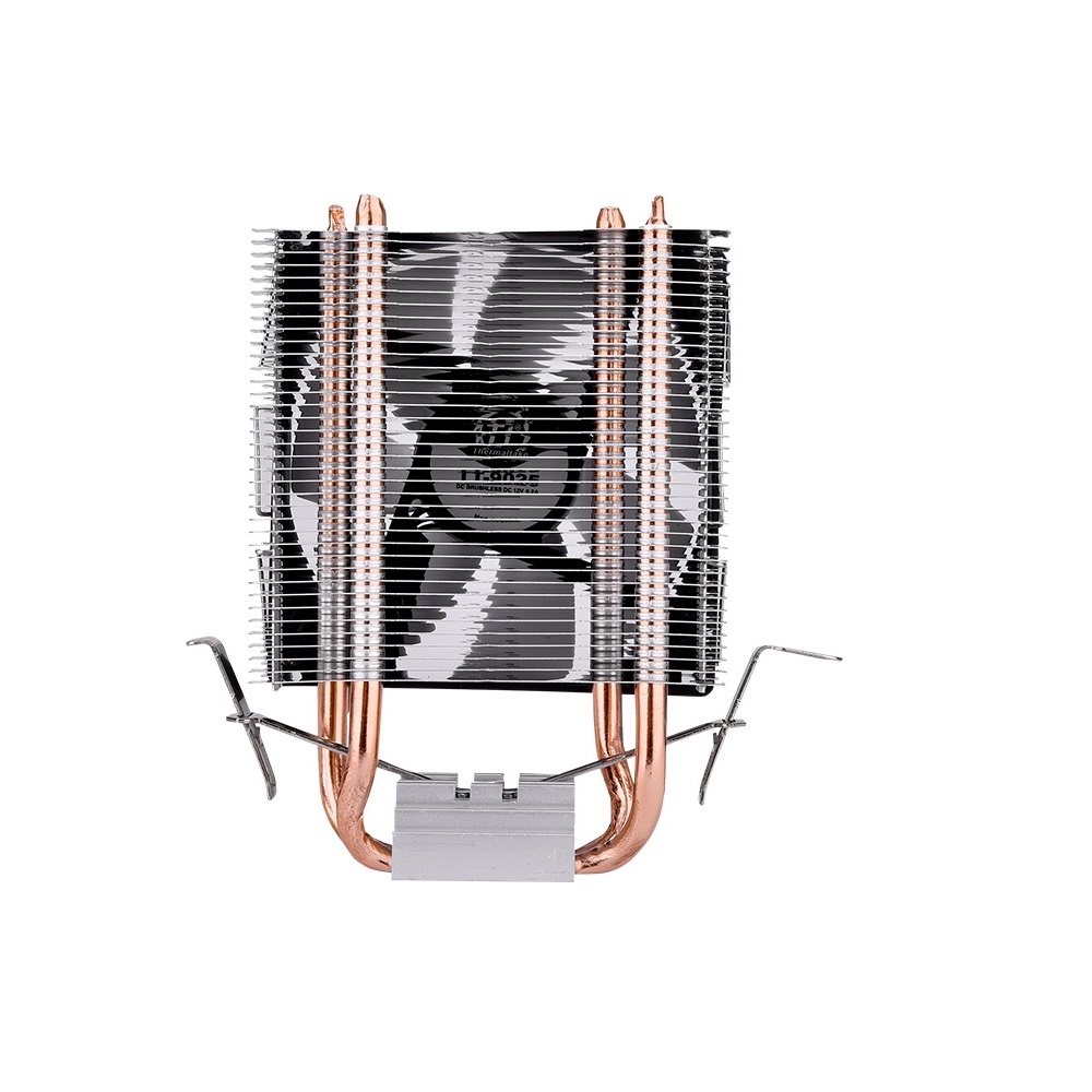 The heat sink is made of 0.4mm thick aluminum with 2.5mm air gaps and 2 Ø6mm solid copper heat pipes that run through the fins for maximum heat conductivity. The heat pipes are made to contact the CPU directly to ensure fast and efficient heat dissipation and enhances the overall thermal performance.