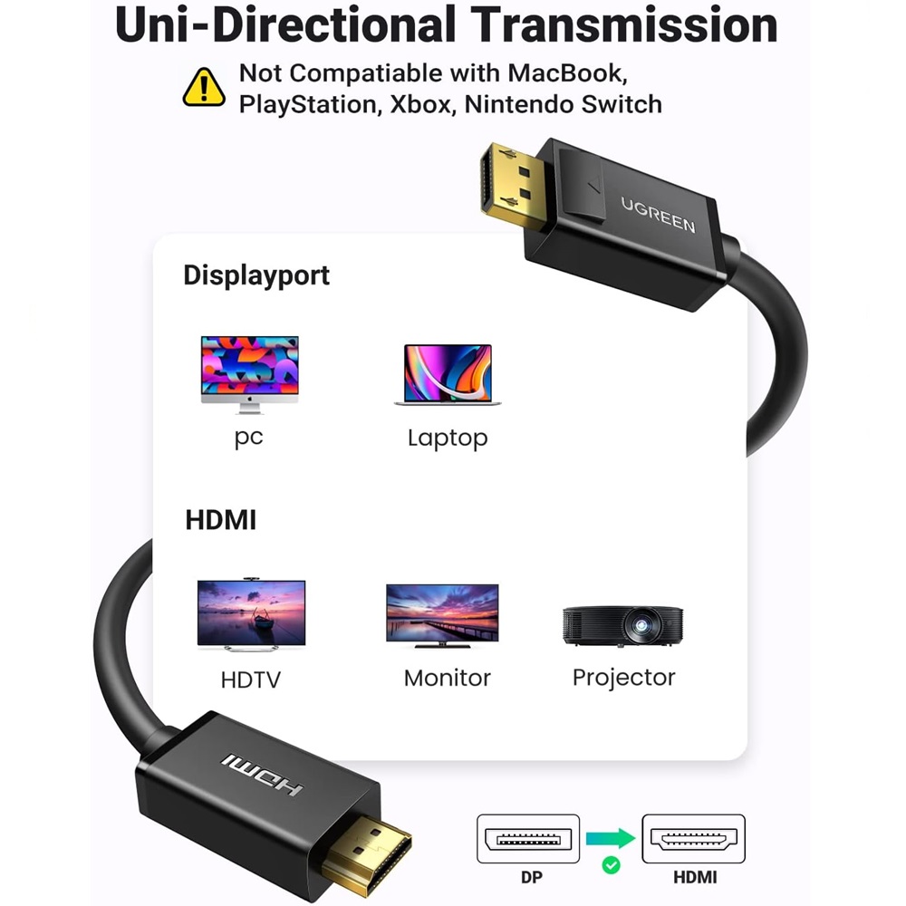 Stable Transmission: UGREEN DisplayPort to HDMI 6FT Cable with Advanced Processor Chip, which can transmit high-definition video and audio from your computer to an HDTV for video streaming or gaming with stunning clarity and authentic audio. Designed for a remarkable user experience with no visual or audio glitches, artifacts, or audio/video synchronization problems. It is not bi-directional: not support HDMI to DP.