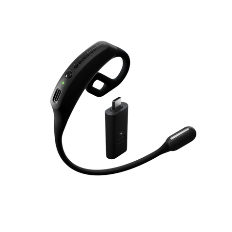 SteelSeries Power, Pairing, and Mute buttons USB-C Wireless dongle SoftFlex earhooks Open-ear design