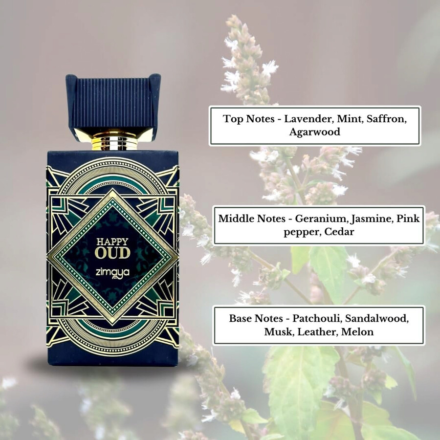 Gender Unisex Model 6290171072218 Size 3.4 oz / 100 ml Type Extrait De Parfum Base Spray Fragrance notes Scent Happy Oud Launch Year 2023 Top Notes Lavender, Mint, Saffron, Agarwood Heart Notes Geranium, Jasmine, Pink pepper, Cedar Base Notes Patchouli, Sandalwood, Musk, Leather, Melon