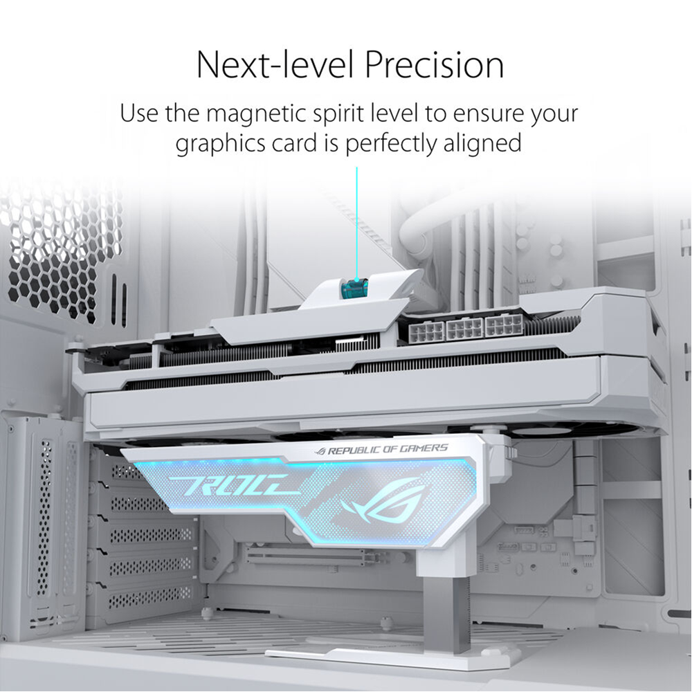 The ROG Herculx packs the structural integrity to bear the burden of even the heaviest graphics card. Toolless installation, precision adjustment, and customizable RGB lighting are combined into a space-saving design that neatly slides in to protect your investment in GPU horsepower.