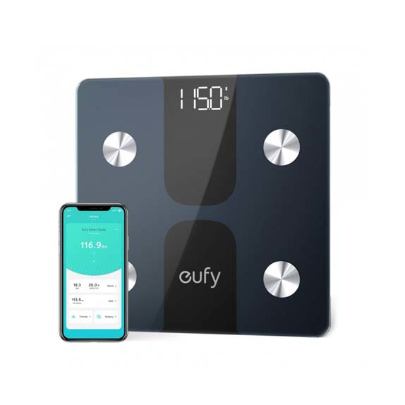 Eufy C1 scale from Anker _ compatible with Fitbit programs, Google Fit, Apple healthy _ Uses up to 16 users _ works on measuring 12 features _ works on measuring weight, fat percentages, body mass, muscle mass, bone mass, body water percentage , full body mass index, estimating the amount of energy by measuring BMR, visceral fat percentage - calculating body age and stages of formation - powered by AAA3 battery