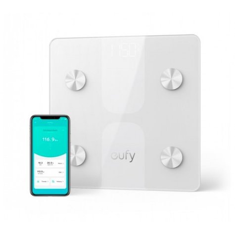 Eufy C1 scale from Anker _ compatible with Fitbit programs, Google Fit, Apple healthy _ Uses up to 16 users _ works on measuring 12 features _ works on measuring weight, fat percentages, body mass, muscle mass, bone mass, body water percentage , full body mass index, estimating the amount of energy by measuring BMR, visceral fat percentage - calculating body age and stages of formation - powered by AAA3 battery